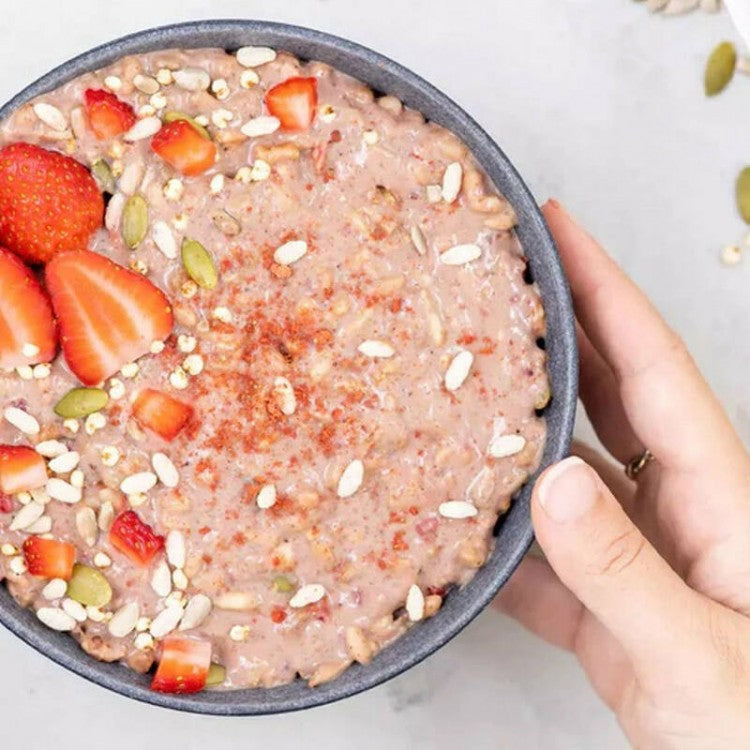 Nutritionally complete breakfast with fruit, grains, superfoods, seeds, and protein.